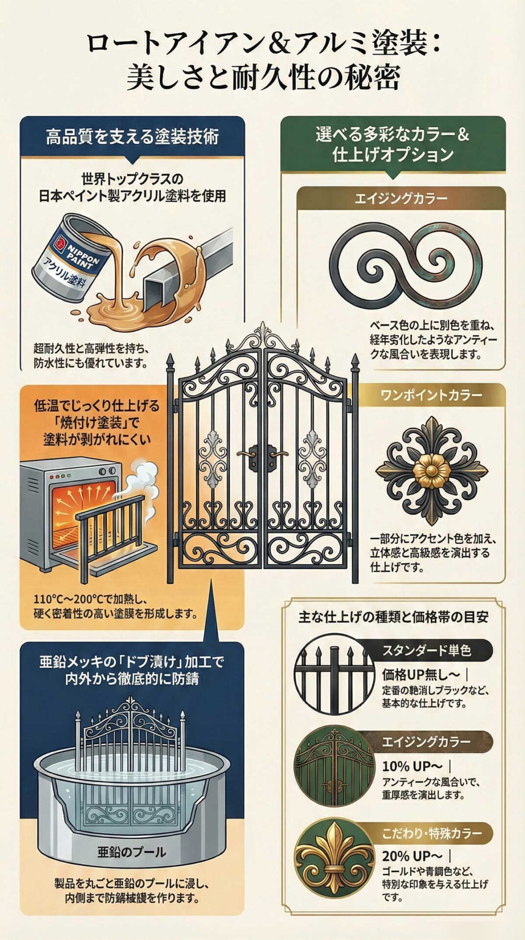 高い耐久性と美しさを兼ね備えた、アイアン・アルミの焼付塗装