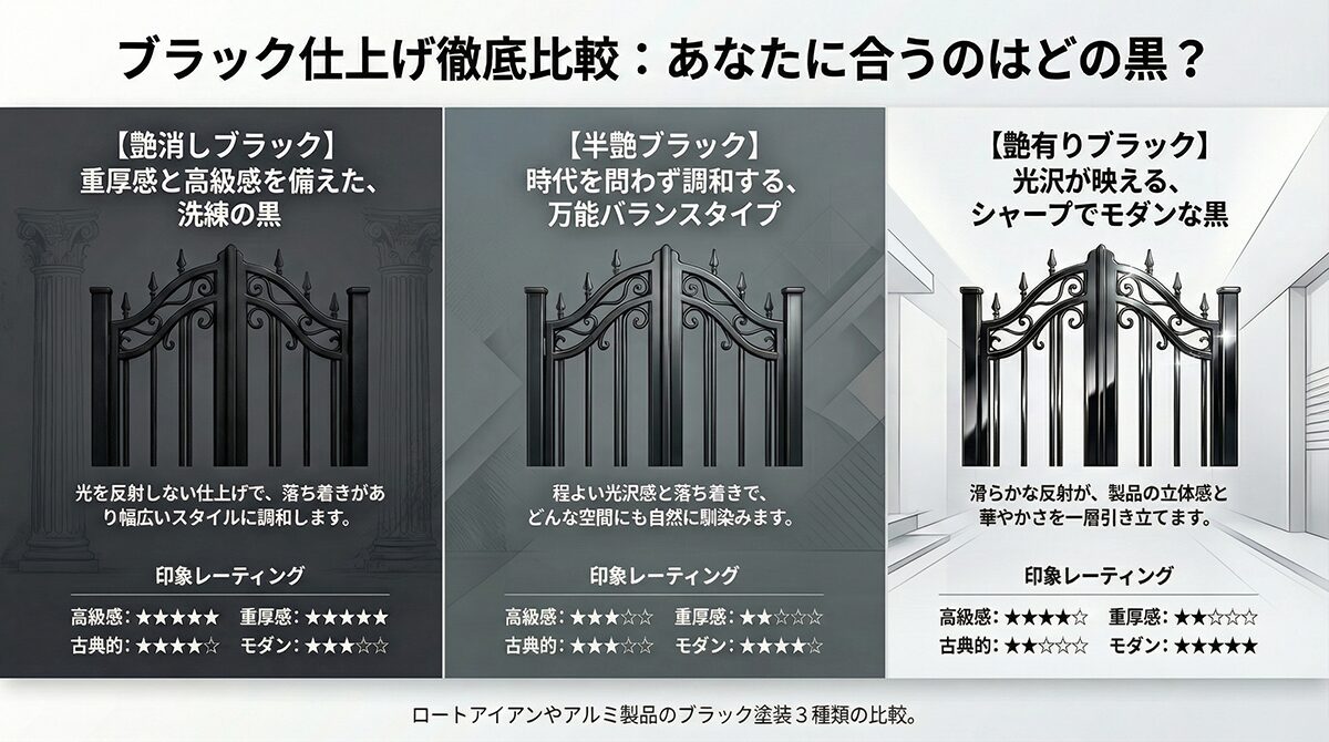 光を映し出す「艶ありブラック」は、ロートアイアンやロートアルミの造形美を際立たせる華やかな仕上げです。上品な光沢が高級感を添え、クラシックからラグジュアリーな空間まで幅広く対応。滑らかな反射が生み出す陰影が、装飾の立体感と存在感をより一層引き立てます。。