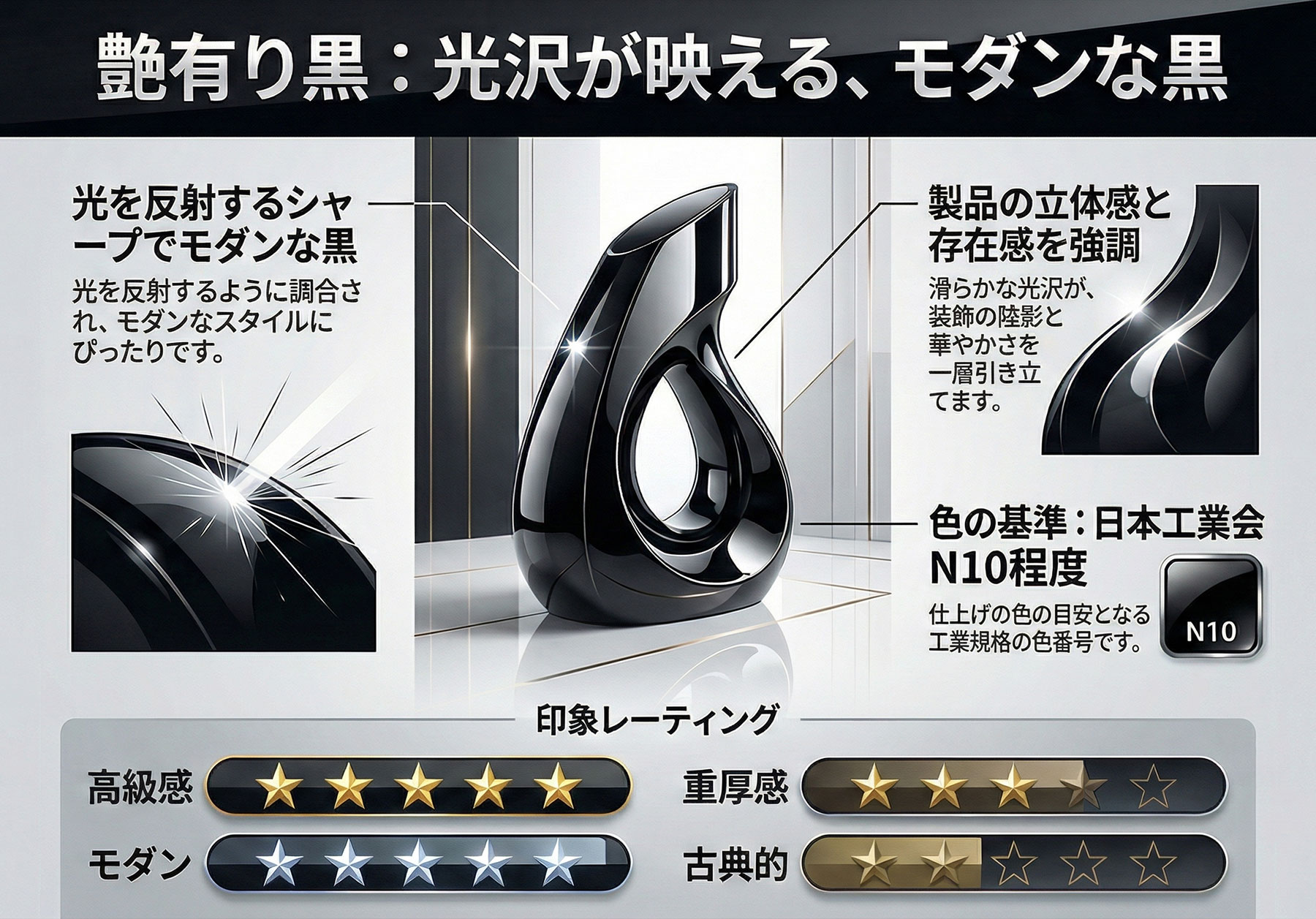 光を反射させるよう調合されたブラックはモダンスタイルにぴったりです。色の仕上がりとしては日本工業会の色番号だとN10程度です。