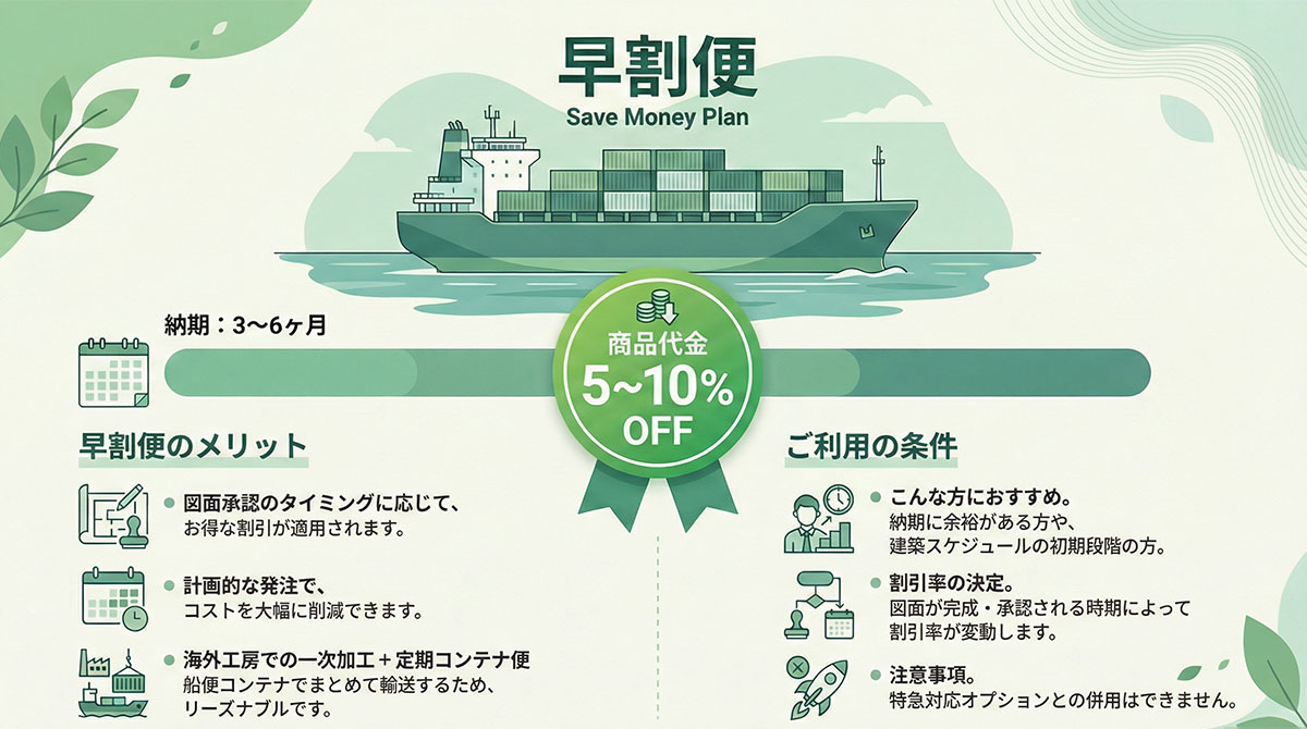 | 早割便 | 3-6ヶ月 | 早期発注による計画生産 | 設計段階での余裕がある場合 | 5〜10%OFF |