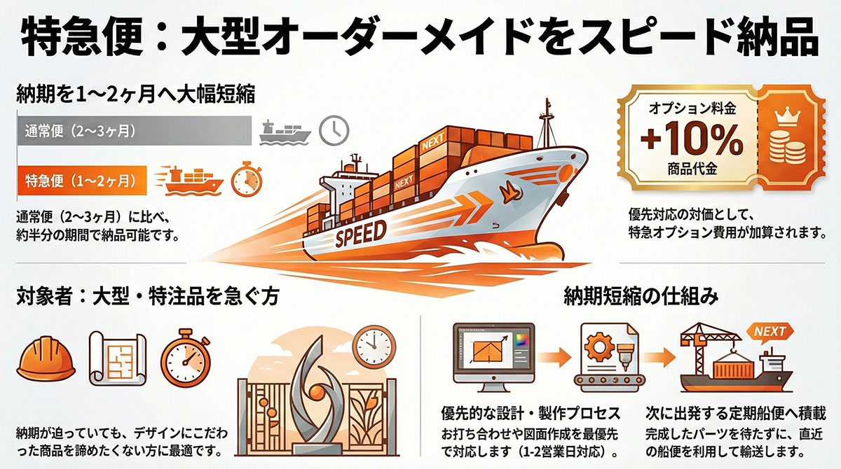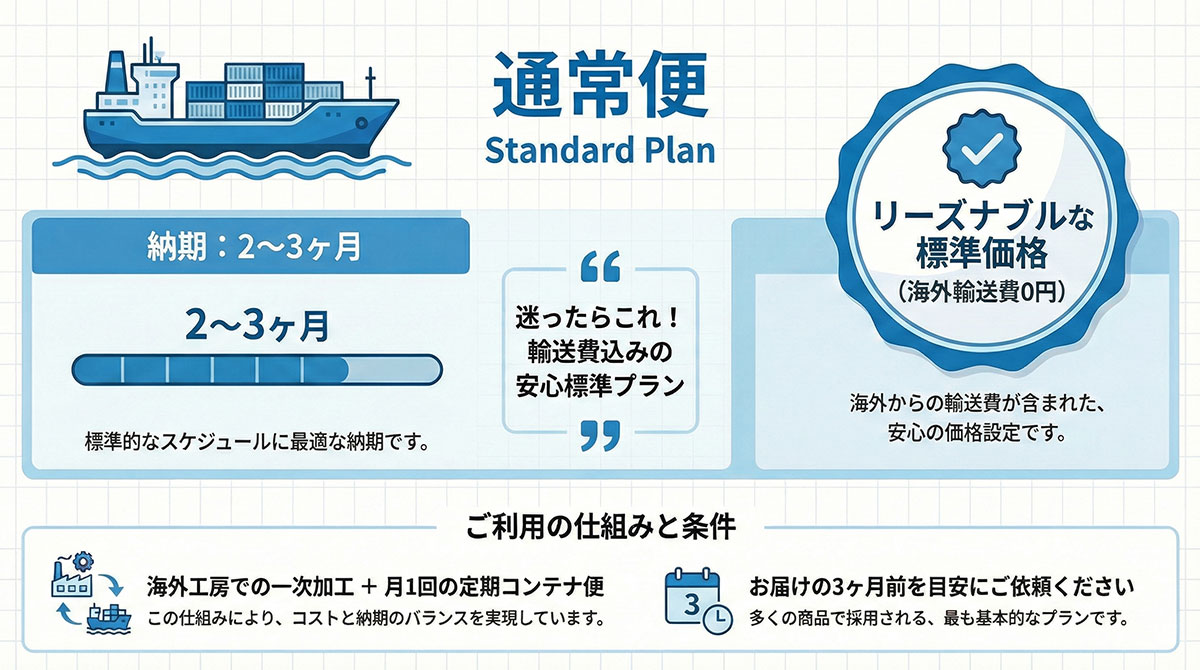 | 通常便 | 2-3ヶ月 | 最も標準的な製作フロー | 新築・リフォームで標準的な工期 | 標準価格 |