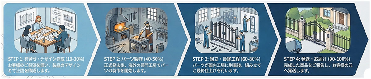 世界に一つだけのロートアイアンを製作するには、相応の時間が必要です。一般的な既製品とは異なり、デザインの確定から鉄の切断、鍛造、そして塗装に至るまで、すべての工程がお客様のためだけに行われるオーダーメイドだからです。通常、ご契約から納品まで4週間から8週間程度の期間を頂戴いたしますが、私たちはその期間を単なる「待ち時間」にはいたしません。