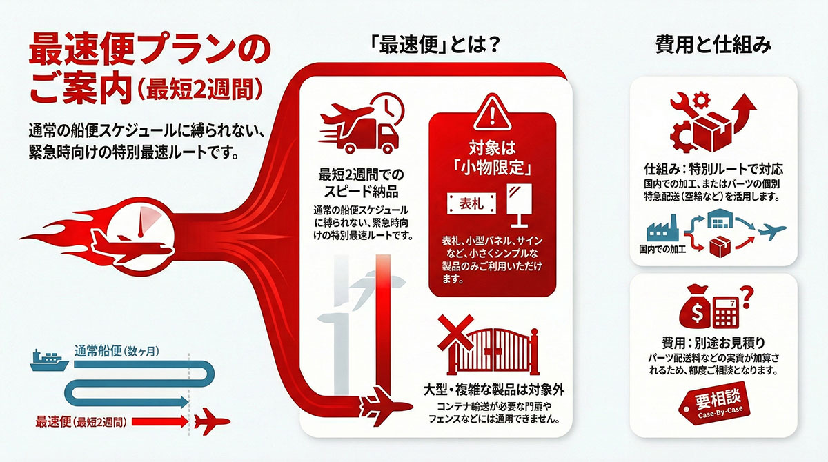| 最速便 | 2週間〜 | 最優先ライン・航空便対応可 | 表札、手すりパーツ、妻飾り等小物 | +10% |