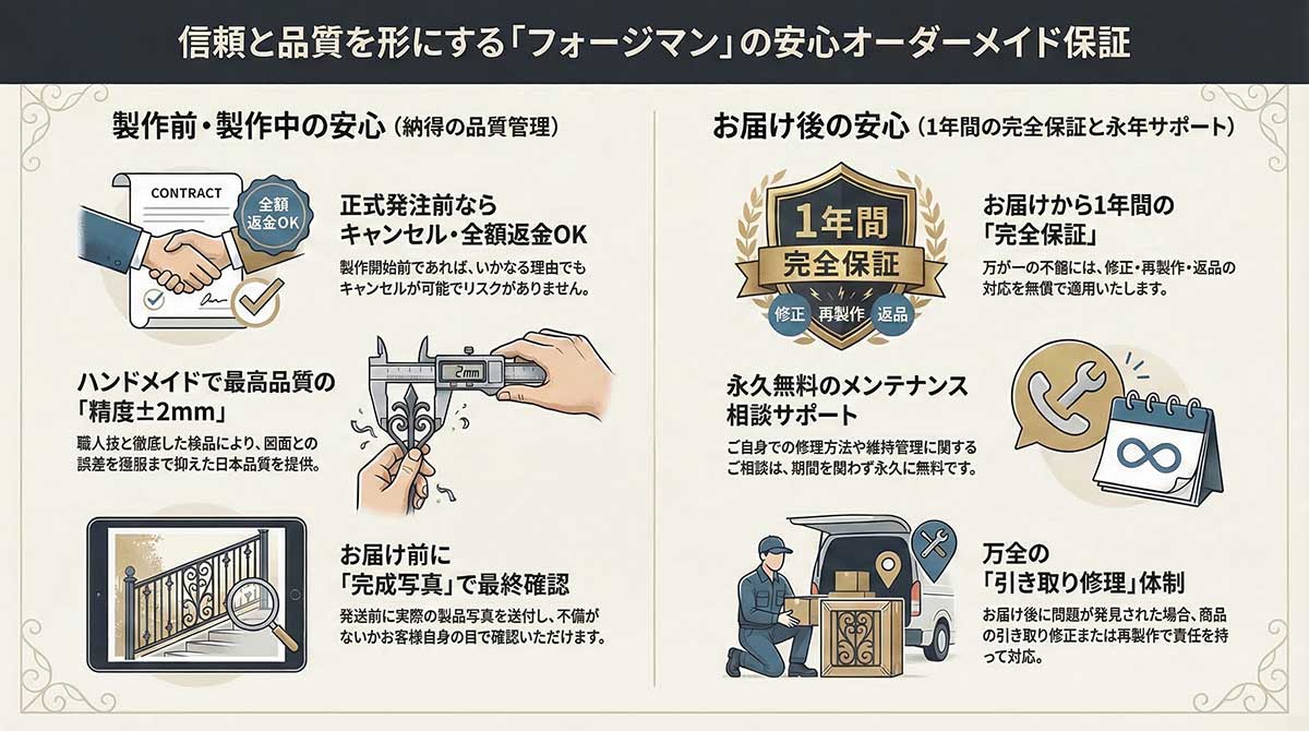 信頼と品質を追求する『フォージマン』の商品保証オーダーメイドをご依頼頂いた商品の保証とお約束 安心してお取引頂ける「商品保証付き」 万が一の商品不備や破損にもしっかり対応いたします。 ◇ 安心してお取引きできるように次のお約束をいたします。 いつでもキャンセルOK どのような理由であっても、正式発注前(製作開始前)ならキャンセル&全額返金が可能です。 徹底した検品と高品質 弊社の技術チームが、細かい部分までこだわり、ご依頼頂いた図面と寸分変わらない商品をお届け。 お届け前に写真で確認 お届け前に実際に作られた商品の画像をお送りし不備などないか確認頂けます。 ◆ 商品保証内容 商品精度±2mm 商品の性質上、塗装や溶接の際に若干のひずみがありますが、商品精度±2mmで作られておりハンドメイド製作としては最高品質です。腕の良い職人としっかりした商品チェックで安心の日本製品質です。 お届から1年間 お届け後1年間が完全保証です。万が一、不備が出てきた場合は保証対象となり修正、再製作、返品の対応が適用されます。取外し費用等に関しては対象に含まれませんのでご了承下さい。 引き取り修理 徹底的な品質管理と厳しい目で検品された商品をお届けします。お届け前に画像チェック頂いたり万全の体制を心がけてますが、万が一お届け後に発見された問題に関しては商品引取り修正(又は再製作)での対応となります。 ◇ 保証対象外について 商品お届けまで 施工設置サービスは行っておりません。お近くの工務店、施工業者などに依頼する必要が御座います。また全国の協力施工業者を無料でご紹介させて頂きます。 施工業者紹介サービス 通常の状況下以外 通常の状況下以外での使用の場合や第三者により受けたダメージなどは含まれません。 施工に関する費用 いかなる場合でも設置、取り外し等に係る費用の負担はしておりません。ご了承下さい。 メンテナンス・修理サービスをご利用いただけます。 万が一、修理やメンテナンスが必要になった場合は、引取りメンテナンスサービス(別途費用)をご利用いただけます。また、お客様ご自身で行われる修理方法のご相談などサポートは永久に無料でさせて頂きます。**基本的に、直接お伺いする修理サービスは行っておりませんが、一部地域によっては可能な場合が御座いますので、ご希望の方はお気軽にご相談下さい。 タグ ロートアイアン ロートアルミ 商品保証 商品精度