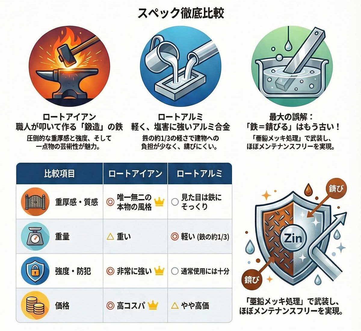 ひと目でわかる!アイアンとアルミの比較一覧表