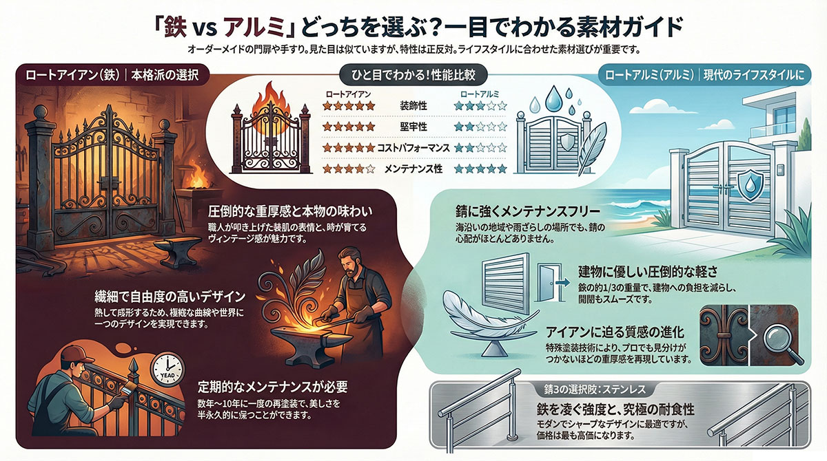 住まいの顔となる門扉や、空間を彩る手すり。オーダーメイドで製作する際、最も多くのお客様が悩まれるのが「ロートアイアン(鉄)」にするか、「ロートアルミ」にするかという素材選びです。「鉄は錆びるから心配」「アルミは質感が軽いのでは?」といった疑問をお持ちではないでしょうか?実は、技術の進歩により両者の差は縮まりつつありますが、それでも埋まらない決定的な「個性」の違いがあります。
