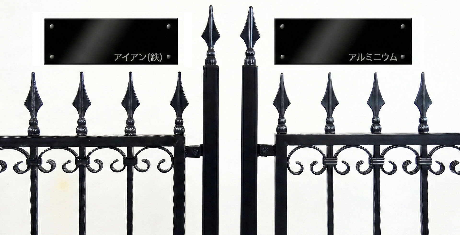 全く同じデザインと仕様でアイアンとアルミの両素材で製作した例です。写真からは全く違いが分からないほどです。一部の装飾はアルミでは既成品が無い場合がありますが、ほとんどの場合はどちらの素材でも同じデザイン仕上がりが可能です。